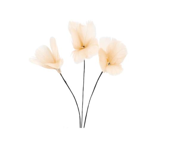 Fjær med ståltråd, formed som blomster. Perfekt for å dekorere greiner eller blomsterarrangement. Finnes i flere farger.
