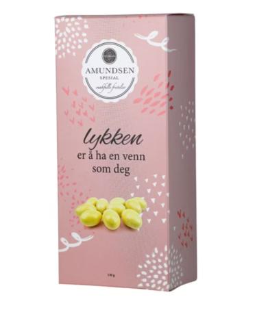 ngredienser: Sukker, MANDEL (20 %), kakaosmør, HELMELKSPULVER, MYSEPULVER, LAKTOSE, konsentrert pasjonsjuice, surhetsregulerende middel (eplesyre, natriummalat), emulgeringsmiddel (SOYALECITIN), naturlig pasjons aroma, naturlig vanilje aroma, farge fra konsentrat (safflor), E904, glukosesirup, modifisert tapiokastivelse, vegetabilske oljer (kokos, raps) Kan inneholde spor av HASSELNØTT, CASHEWNØTT, PARANØTT, PEKANNØTT.