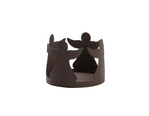 Lysholder i brunt metall til kubbelys med motiv av engler.